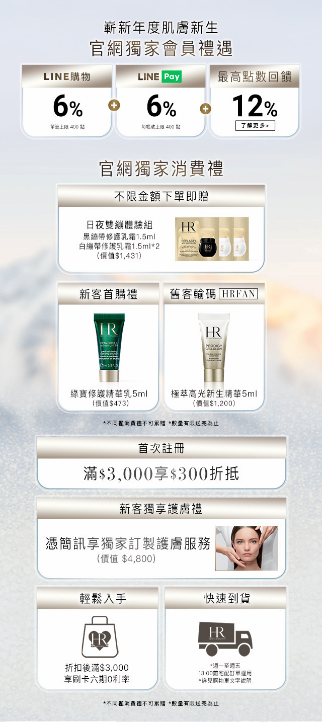※ 結帳當日(含)14天內,消費者若欲退貨,需將全新未拆封正貨(必須為未拆封且可二次銷售之狀態)、等該筆交易產生之消費明細正本與相關贈品(會員贈品、滿額贈品),一同裝箱後,將由赫蓮娜指定之宅配公司收回商品,運費由赫蓮娜負擔。